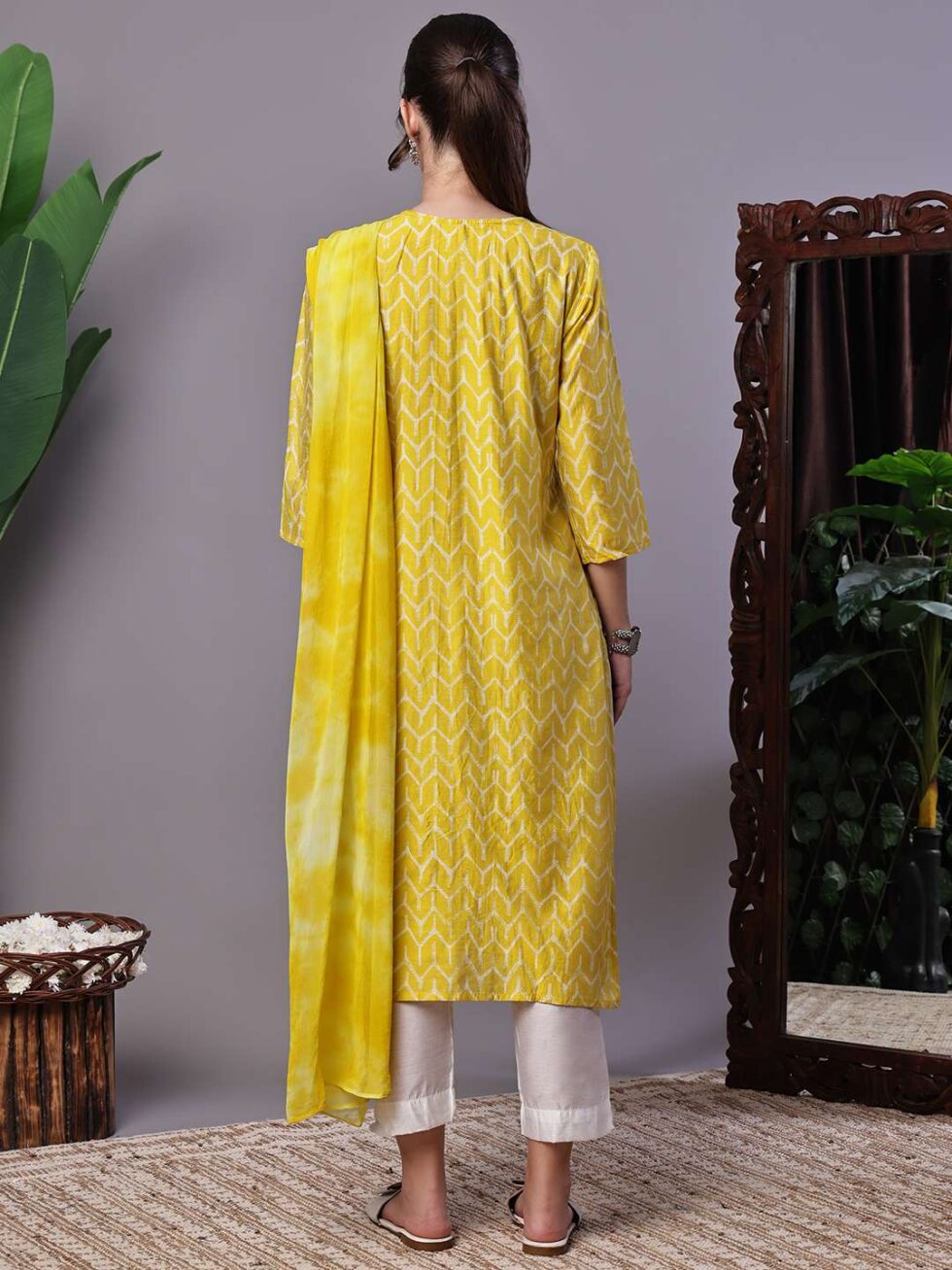 This eye-catching kurta set is perfect for any occasion. It features a beautifully printed kurta with a glamorous, sequin and zari-embroidered yoke on a square neckline. The straight-cut kurta has classic 3/4 sleeves and comes complete with solid white trousers and a coordinating dupatta, offering an effortlessly elegant and comfortable traditional look.